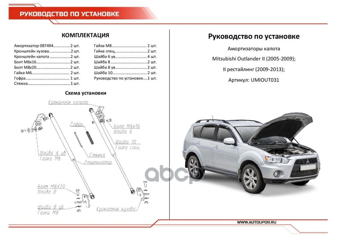 АвтоУпор UMIOUT031 Бренд: Rival, артикул: UMIOUT031, Амортизаторы капота MITSUBISHI Outlander II/II рест. 05-12 (2шт + крепеж).