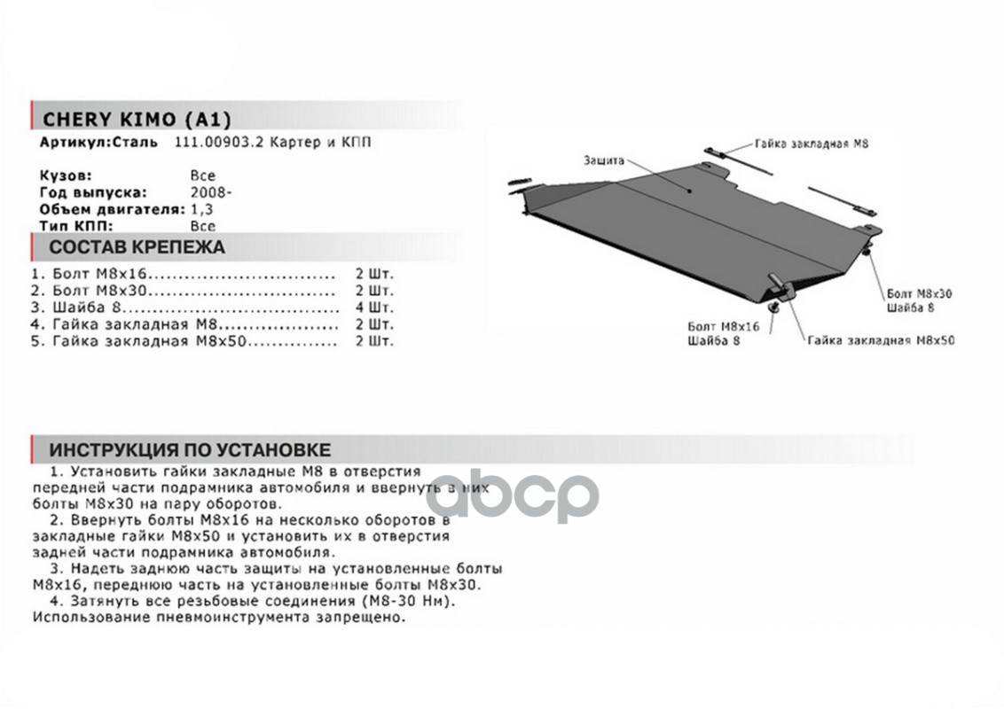 Купить запчасть 111009032 Защита картера + КПП (сталь 1,8 мм) + комплект крепежа для Chery Kimo 2008-2013 с доставкой в Эль-Монте.