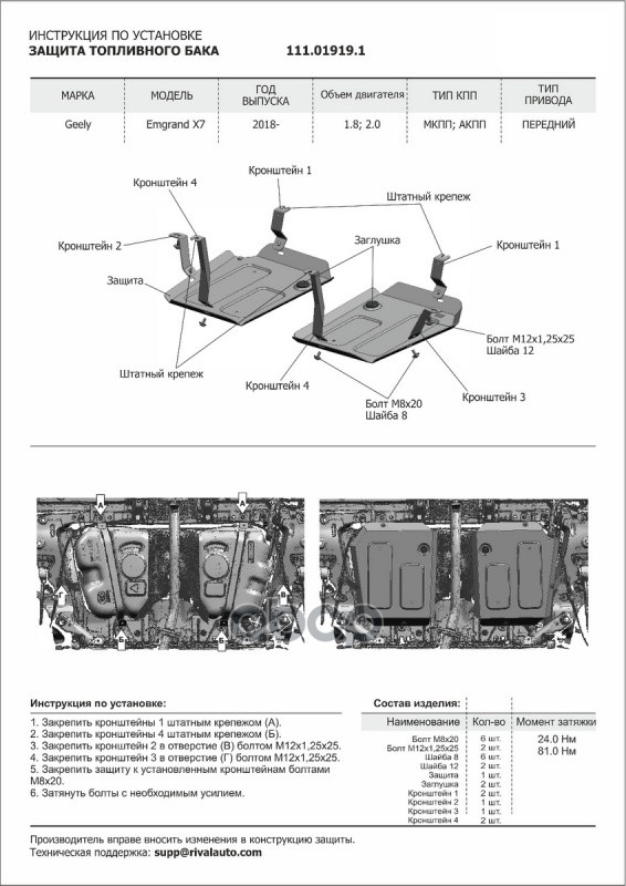 Защита топливного бака и к кт крепежа Geely Emgrand X7 2018 V 1 8 2 0 ста