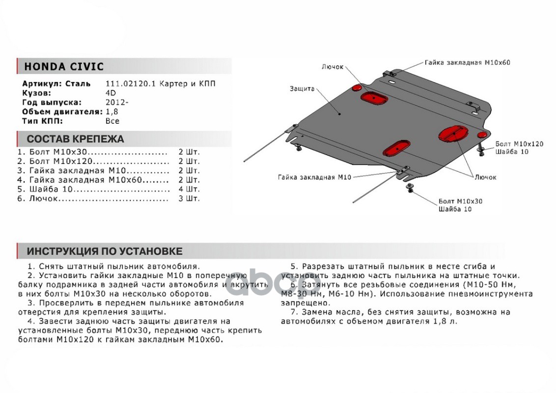 Наименование: Защита картера + КПП (сталь 1,8 мм) + комплект крепежа для Honda Civic седан 201