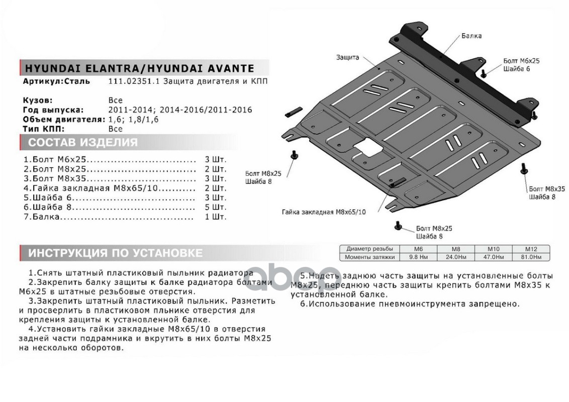 Наименование: Защита картера и КПП HYUNDAI Elantra 1.6/1.8 11-16