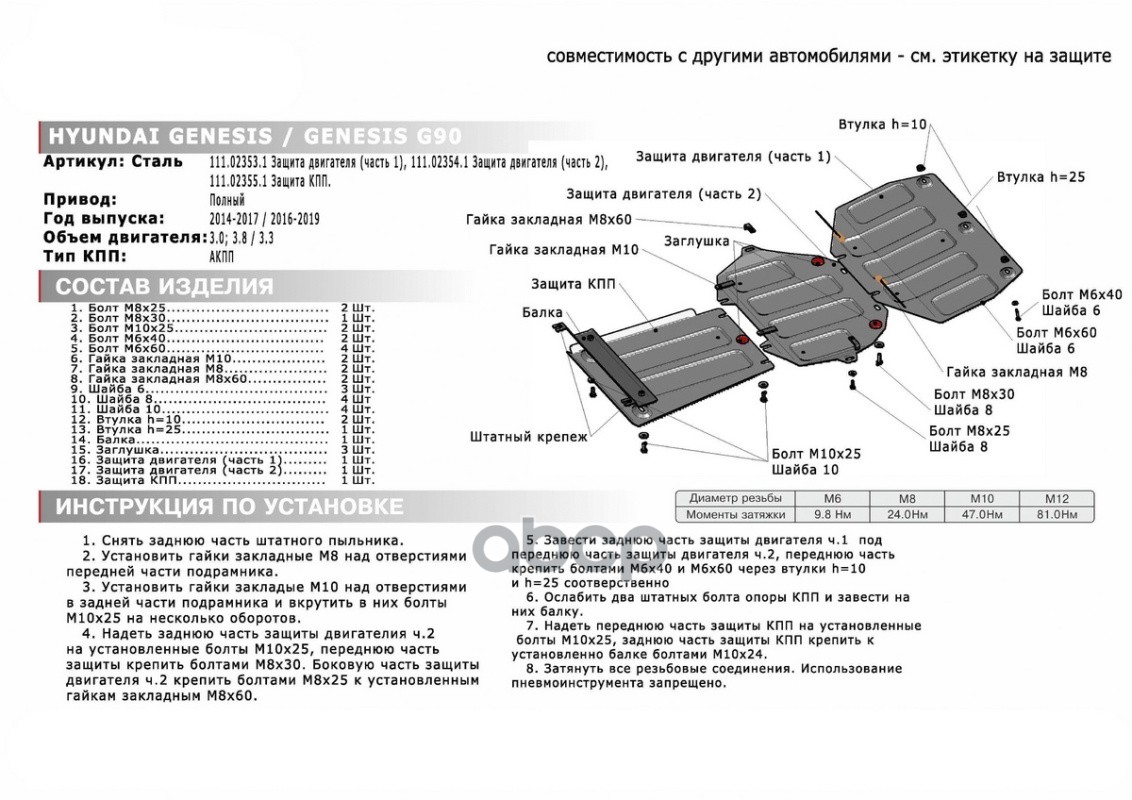 Наименование: Защита картера (сталь 1,8 мм) + комплект крепежа для Genesis G90 2016-2019, 2019