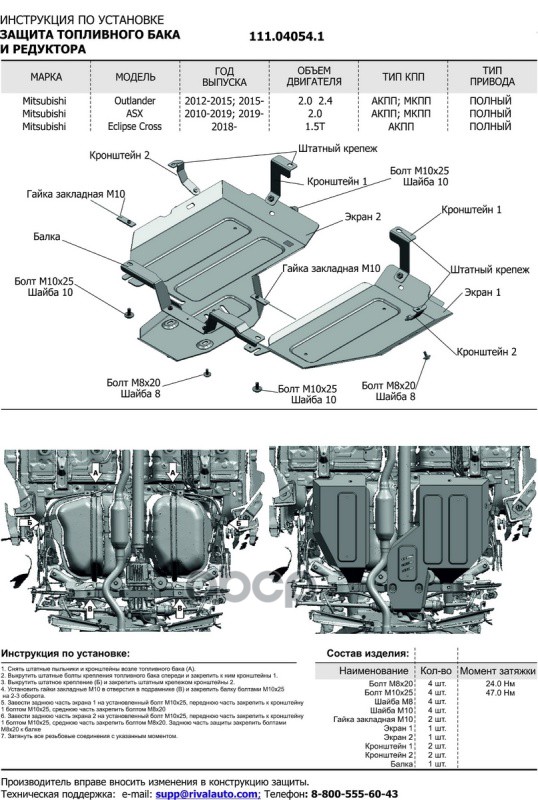 Автоброня 111040541 Бренд: Автоброня, артикул: 111040541, Защита топливного бака + редуктора MITSUBISHI ASX/Outlander 2.0/2.4 10-> (AWD).