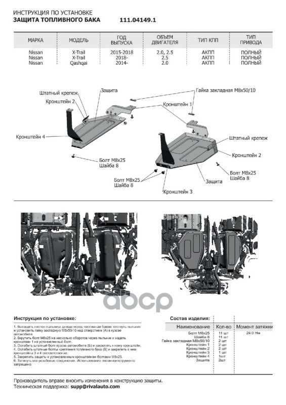 Купить запчасть 111041491 Защита топливного бака (сталь 1,8 мм) + комплект крепежа для Nissan X-Trail 2015 с доставкой по России.