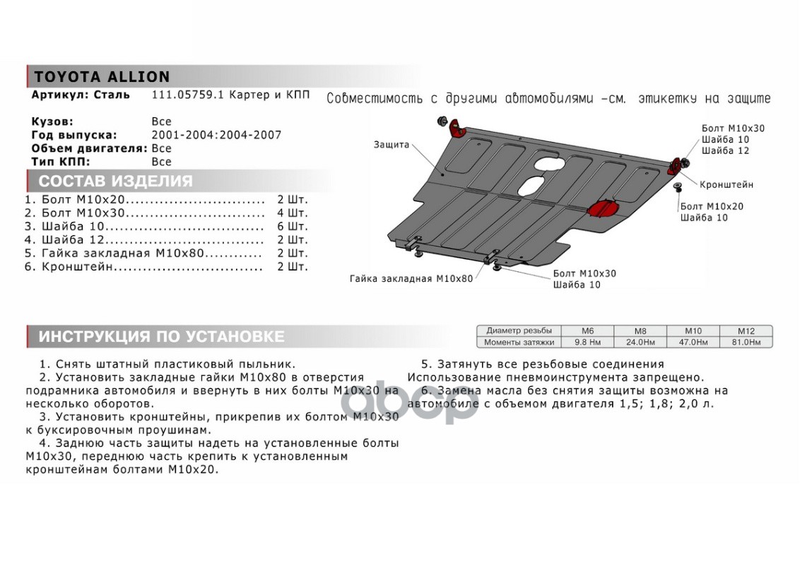 Автоброня 111057591 Бренд: Автоброня, артикул: 111057591, защита картера+КППсталь 1.8 ммToyota Allion I все FWD 01-07, Noah R60 2.0 FWD 01-07.