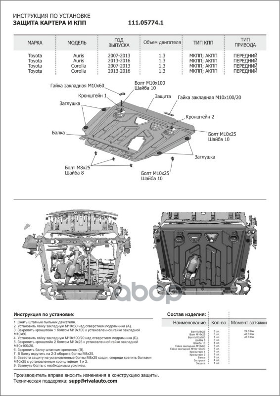 Наименование: Защита картера и КПП с крепежом TOYOTA COROLLA/AURIS (07-13) V-1.3