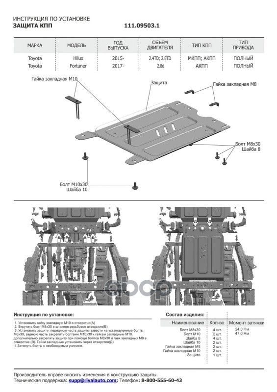 Защита КПП + комплект крепежа, Toyota Fortuner 2017-, V - 2.8d 2,7 полный привод/Toyota Hilux 2015