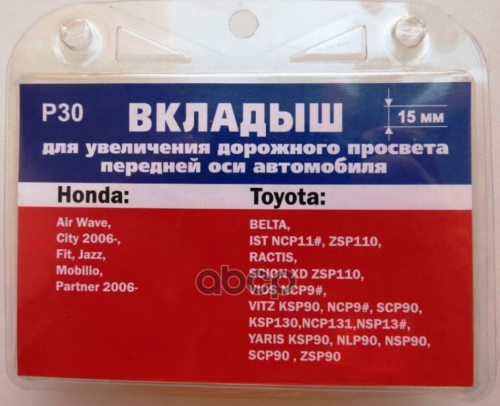 Проставки опор перед к-т 2шт, пластик 15мм, HONDA Fit, Jazz, SUZUKI Swift, TOYOTA Vitz,Yaris (P30) Модель автомобиля: HONDA: Airwave, City 2006-, Fit, Jazz SUZUKI Swift 2005- TOYOTA: Belta, Ist 2007-, Ractis 2005-, Vios 2007-, Vitz 2005-, Yaris 2005-. / Е