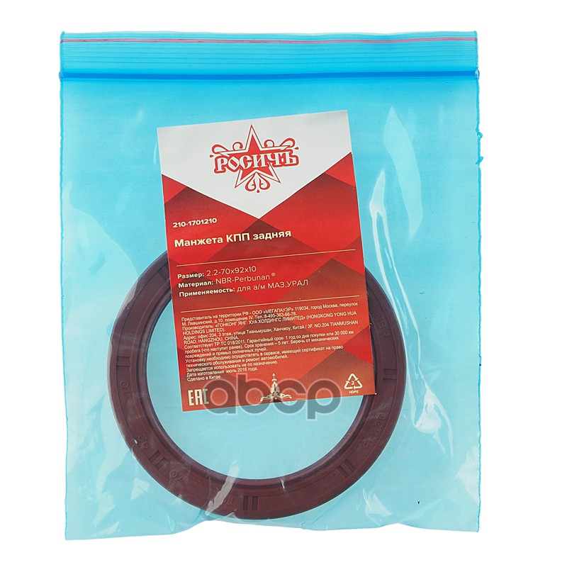 Бренд: РОСИЧЪ, артикул: 210-1701210, Сальник МАЗ,УРАЛ КПП задний 2.2-70х92х10 РОСИЧЪ. |