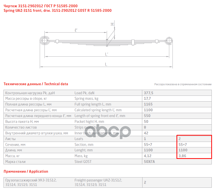 Рессора УАЗ Patriot задняя (2-х листовая) с шарнирами и противоскрипами, а/м с 2018 г.в