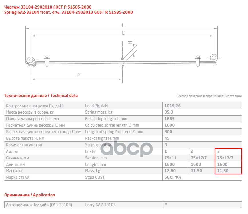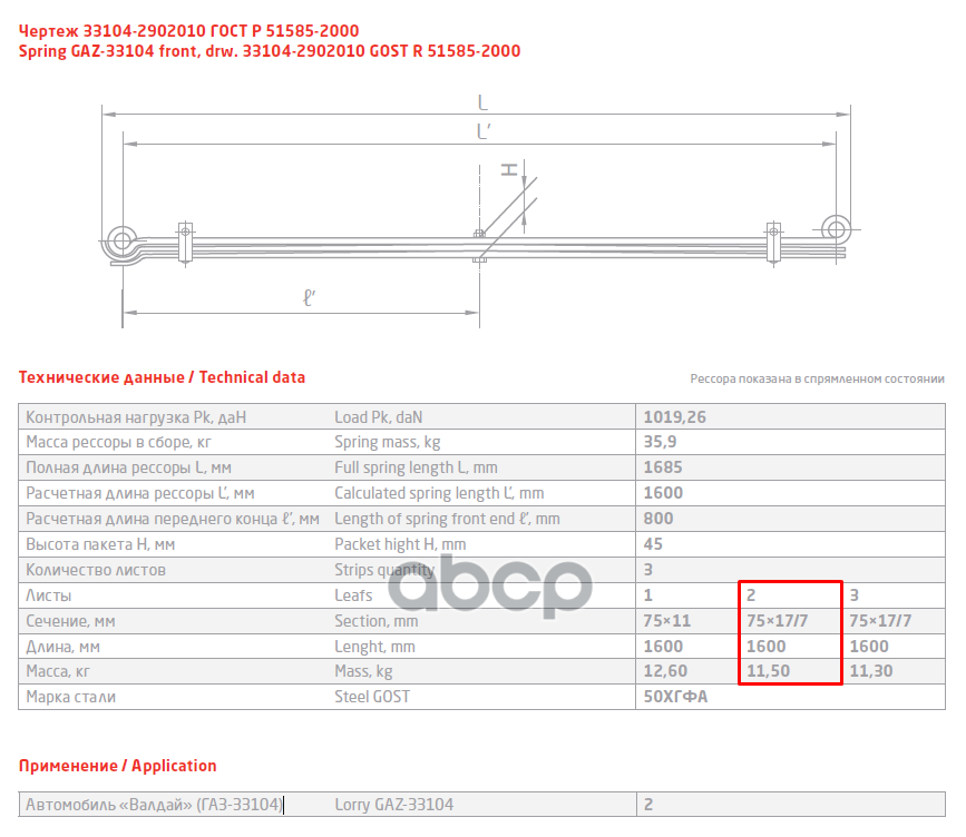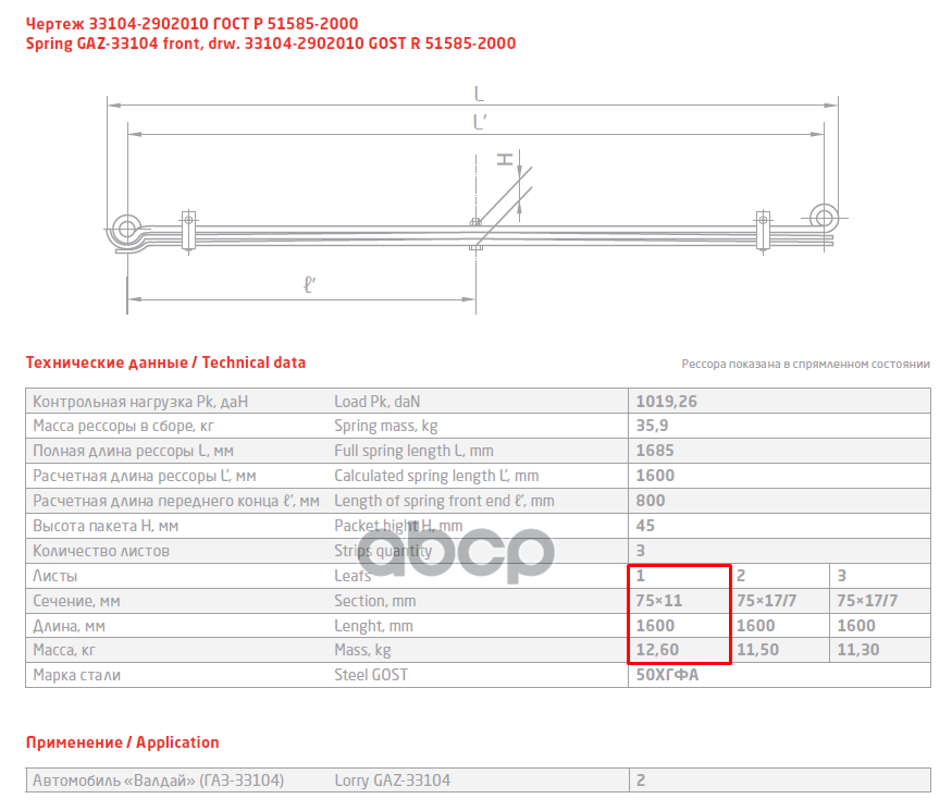 33104-2902102 Лист №2 Рессора передняя для ГАЗ 33104 Валдай, Газон Next 3 листа