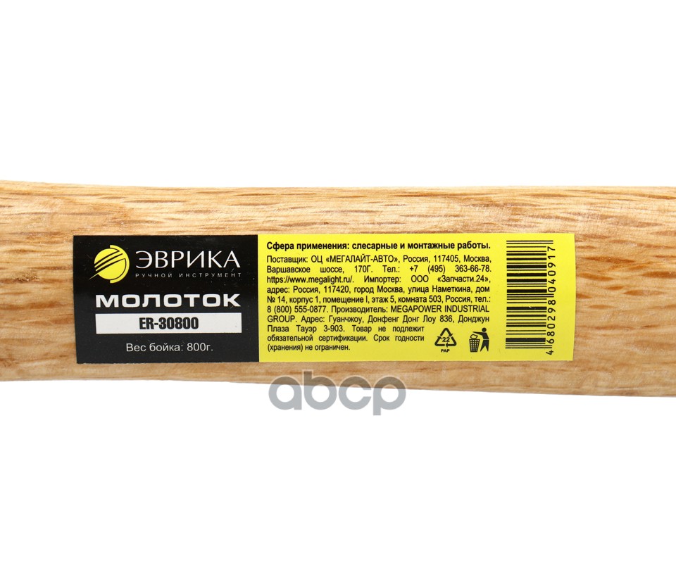 Наименование: Молоток ER-30800: 800 гр., с деревянной рукояткой ЭВРИКА 124 NEW