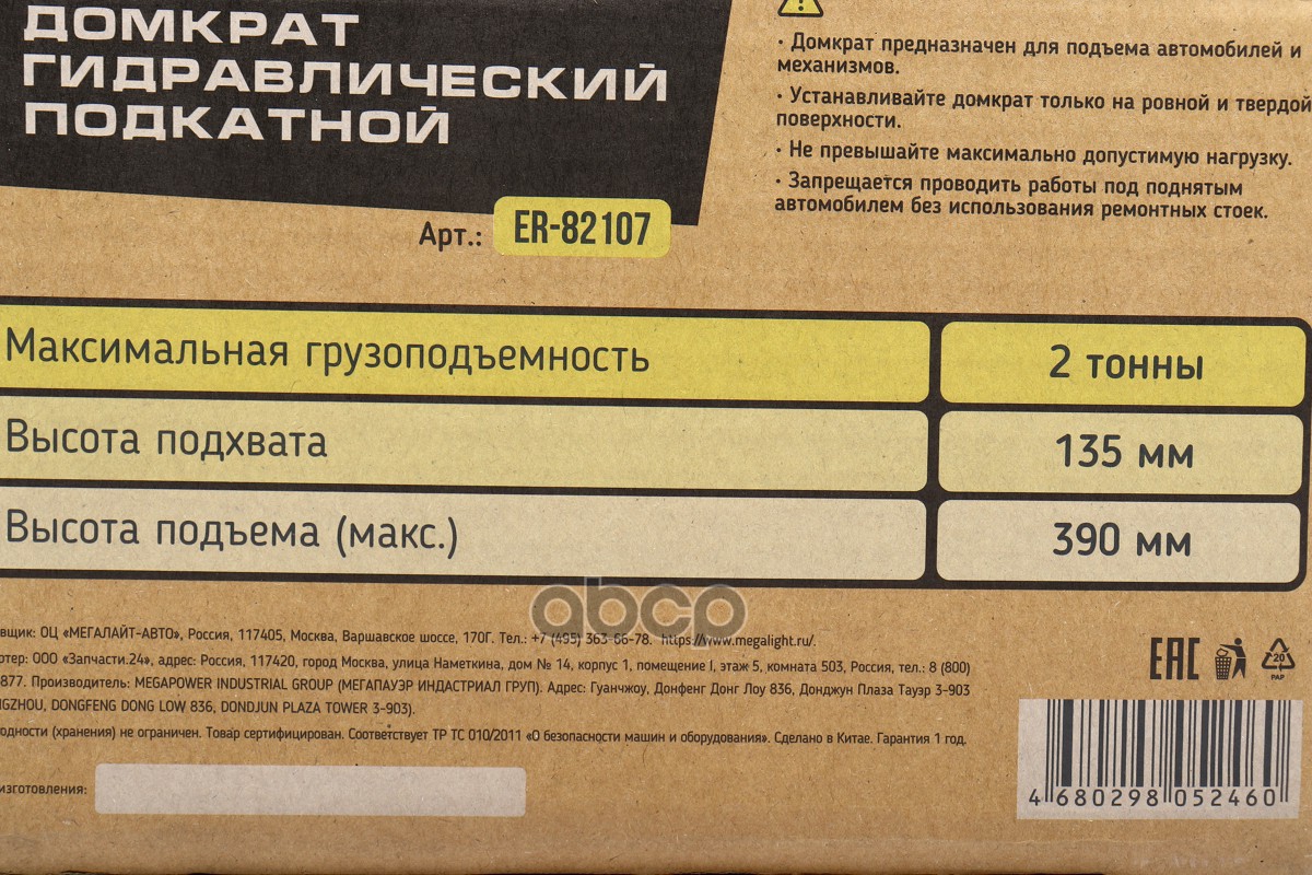 Наименование: Домкрат гидравлический ER-82107 подкатной 2т выс.подъема 135-390мм ЭВРИКА 1 NEW