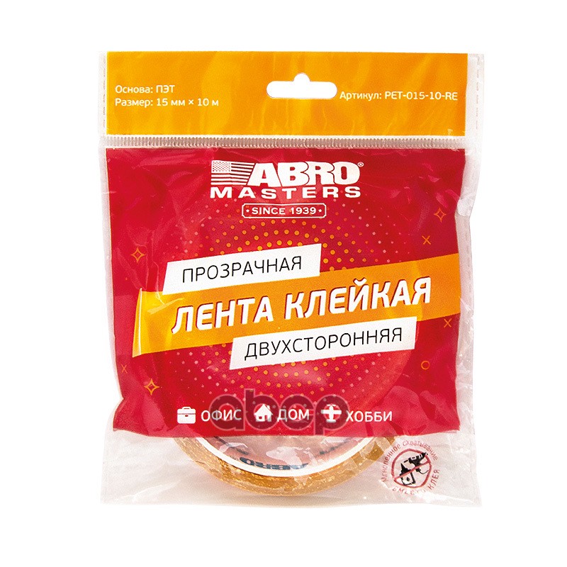 Наименование: Лента клейкая двухсторонняя прозрачная 15 мм х 10 м Abro Masters PET-015-10-RE