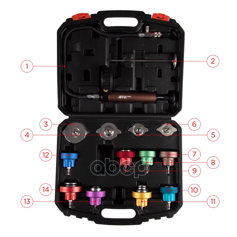 Бренд: AFFIX, артикул: AF10331014C, AFFIX Набор для тестирования герметичности системы охлаждения, 14 предметов, кейс. |