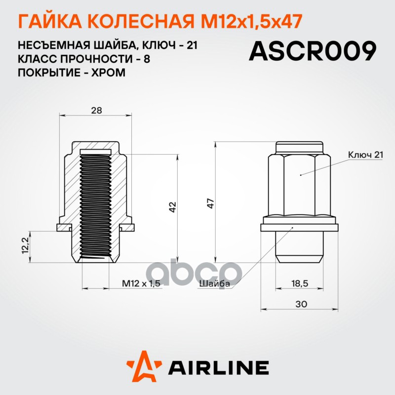 Наименование: Гайка колесная M12x1,5x47, несъемная шайба, кл.21, закрытая, хром для а/м Toyota/Lexus (ASCR009)