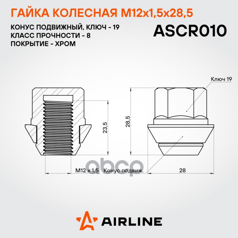 Наименование: Гайка колесная M12x1,5x28,5, конус подвижный, кл.19, закрытая, хром для а/м Ford (ASCR010)