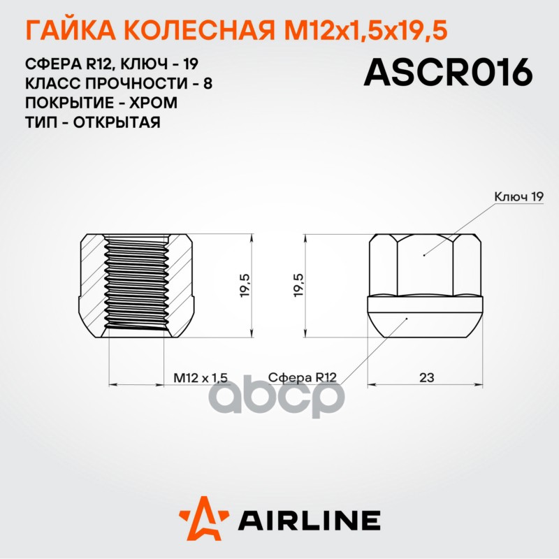 Купить запчасть ASCR016 Гайка колесная M12 x 1,5/Сфера R12 M12x1,5x19,5, сфера R12, кл.19, открытая, хром для а/м Honda с доставкой в Эль-Монте.