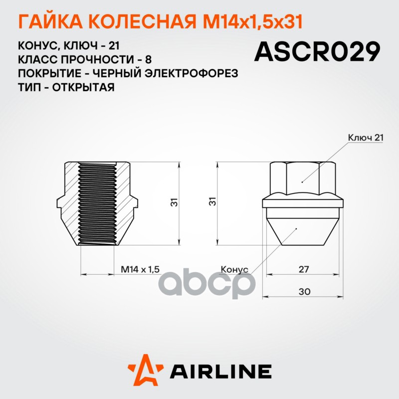 Купить запчасть ASCR029 Гайка колесная M14 x 1,5/Конус M14x1,5x31, конус, кл.21, открытая, черный электрофорез для а/м Ford с доставкой в Эль-Монте.