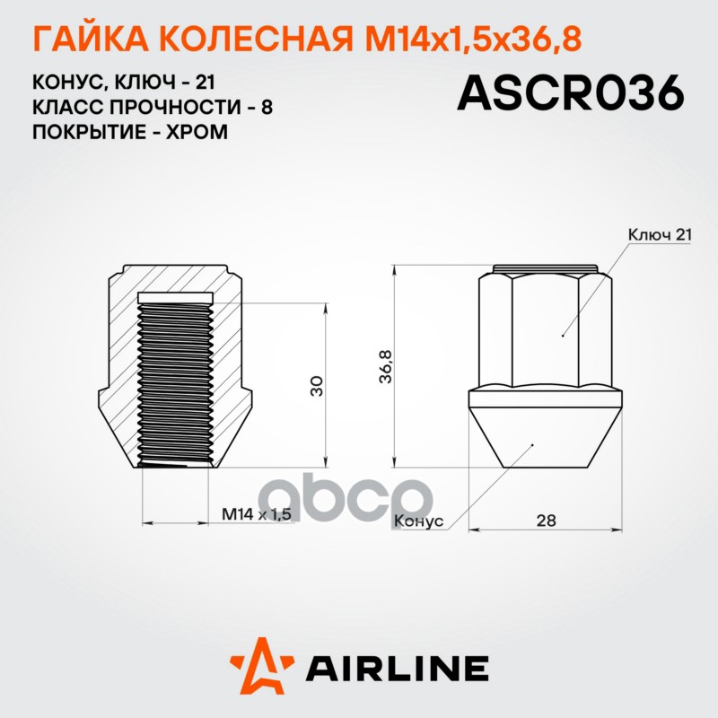 Купить запчасть ASCR036 Гайка колесная M14 x 1,5/Конус M14x1,5x36,8, конус, кл.21, закрытая, хром для а/м Land Rover/Ford с доставкой в Эль-Монте.
