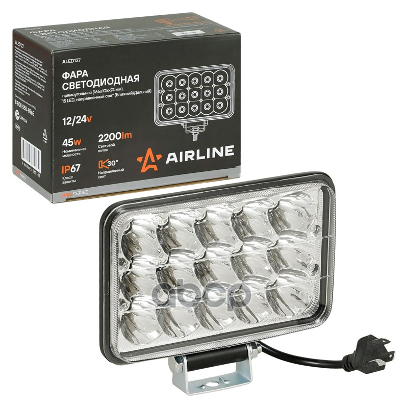 Фара светодиод. прямоугол., 15LED, направл. свет (Ближ./Дальн.), 45Вт, 165x108x74мм, 12/24В, PRO (ALED127)