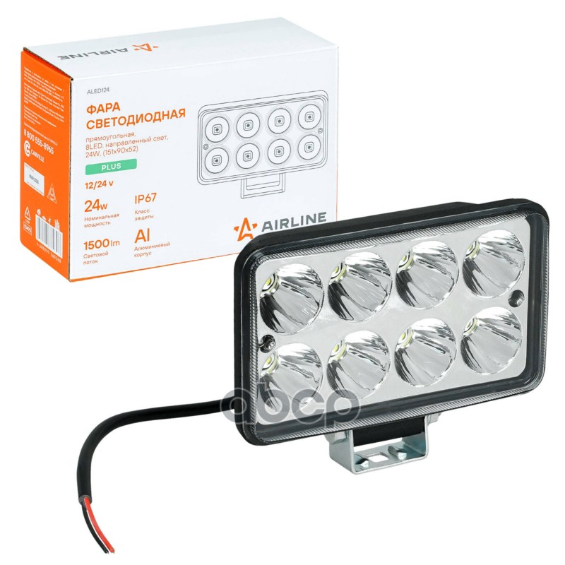 Фара светодиодная прямоугольная 8LED, направленный свет, 24Вт, 151x90x52мм, 12/24В, PLUS