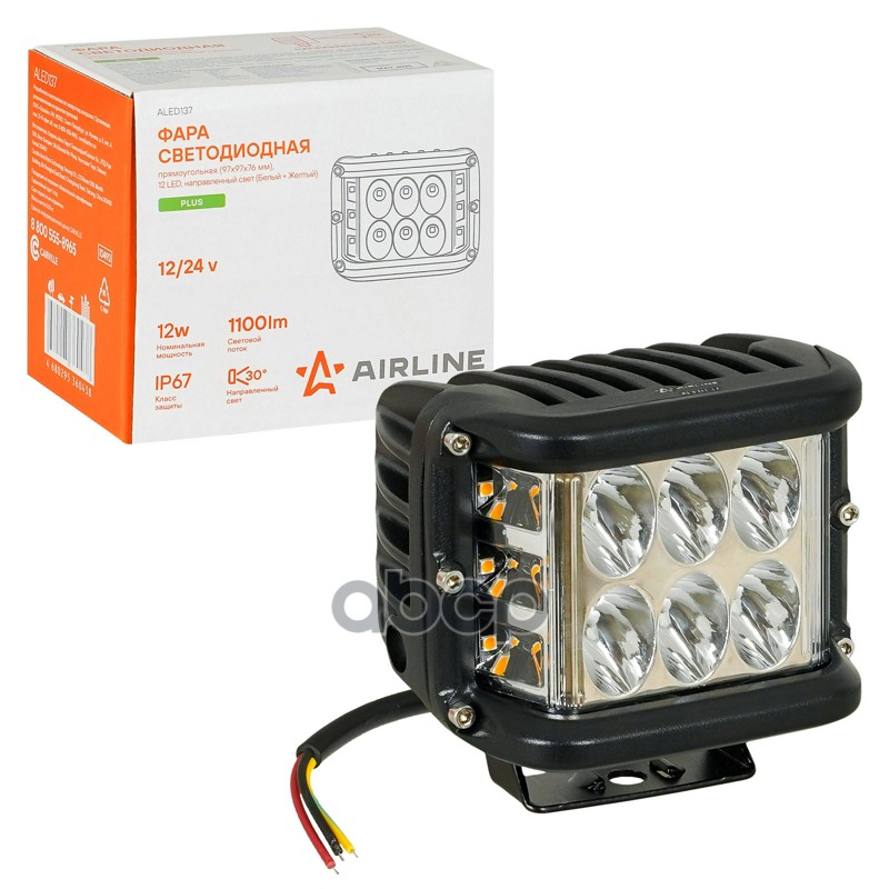 Фара светодиод. прямоугол., 12LED, направлен. свет (Бел.+Желт.), 12Вт, 97x97x76мм, 12/24В, PLUS (ALED137)