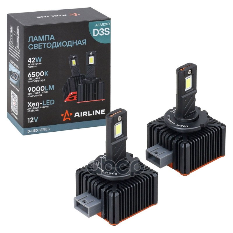 Лампа светодиод. D3S D-LED, 42Вт, 9000Лм (4500Лм x 2), 6500К, 12В, кмпл. 2 шт. Airline