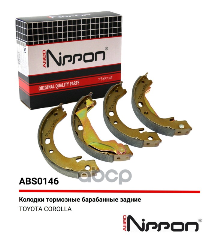 Бренд: ALLIED NIPPON, артикул: ABS0146, Колодки тормозные барабанные | зад | TOYOTACOROLLA / ALLEX (_E12_), 01/01 - 12/07COROLLA седан (_E12_), 08/00 - 03/08COROLLA седан (_E15_), 10/06 -COROLLA универсал (_E11_), 04/97 - 10/01COROLLA универсал (_E12_), 03/01 - 12/08. |