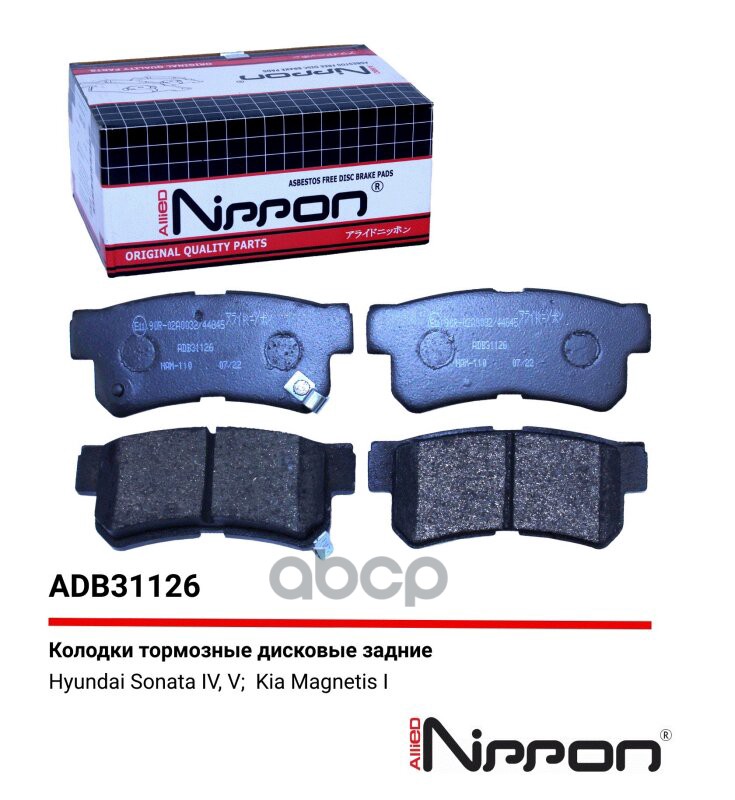 Колодки тормозные Hyundai Elantra (XD) 00-, Matrix (FC) 01- передние Allied Nippon ADB31176 5810117A010;5810117A10;581012DA30;581012DA31;581012DA40;581012DA60;581012SA31;