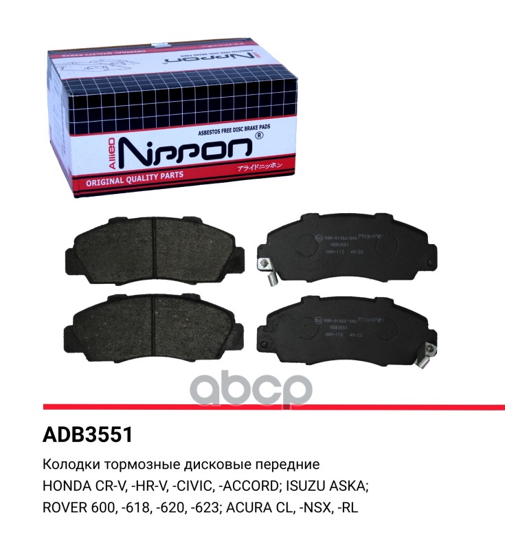 Колодки тормозные дисковые | перед | HONDA CR-V I (RD) 2.0 16V 4WD (RD1, RD3) 01.1999 - 02.2002 <=> HONDA CR-V I (RD) 2.0 16V 4WD (RD1, RD3) 10.1995 - 12.2001 ADB3551
