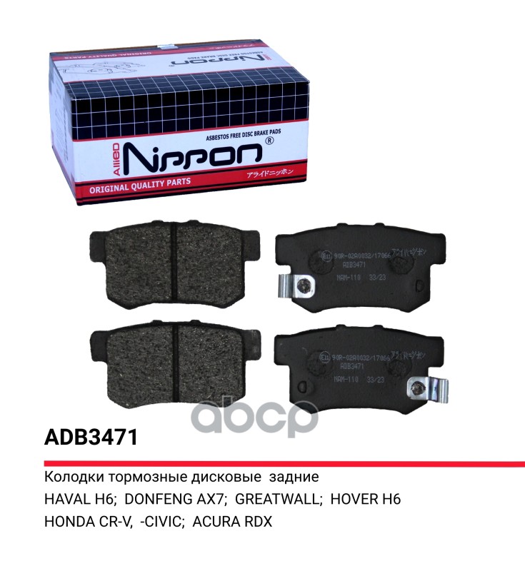 Колодки тормозные Honda Accord 93-, Fit 01-08, CR-V 01-06, Integra 97- задние Allied Nippon ADB3471 GDB3154;GDB3269;GDB3447;06430S0KJ01;06430S0NJ00;06430S2XJ00;06430S3NE50;06430S3NJ00;06430S7AJ00;06430S7S000;06430S9A000;06430S9A010;06430S9AA00;06430S9AE00