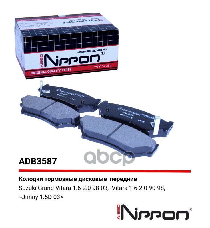 Колодки тормозные дисковые | перед | SUZUKI GRAND VITARA I (FT, HT) 2.0 4X4 (TA52, TL52, SQ 420) 03.1998 - 07.2003 <=> SUZUKI GRAND VITARA I (FT, HT) 1.6 4X4 (SQ 416) 03.1998 - 07.2003 ADB3587