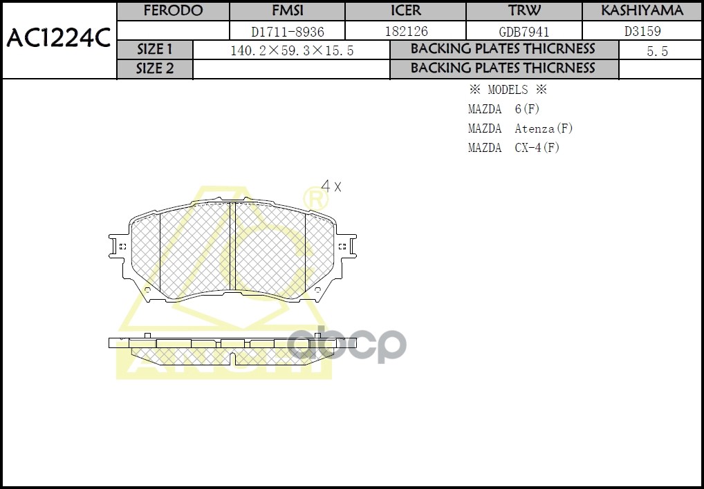 Колодки тормозные Mazda CX-5 11-17 передние ANCHI KDY93328Z, AN783WK, PN25000, D3155, CKMZ70, FP1623, BD5125, 0501CX5F, ADM542100, MS5908