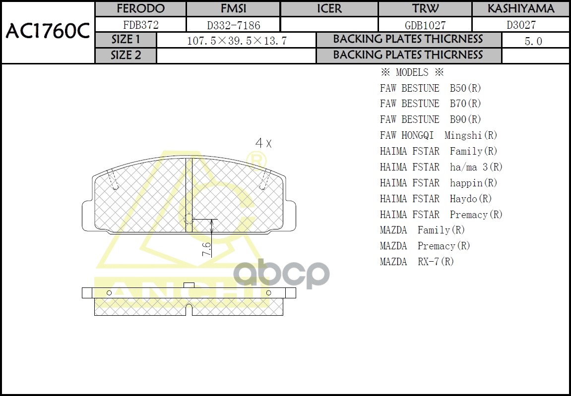 Тормозные колодки ANCHI AC1760C MAZDA ATENZA, FAMILIA - 4WD, RS, CRONOS - GESR, CAPELLA, PREMACY, ATENZA Задн.