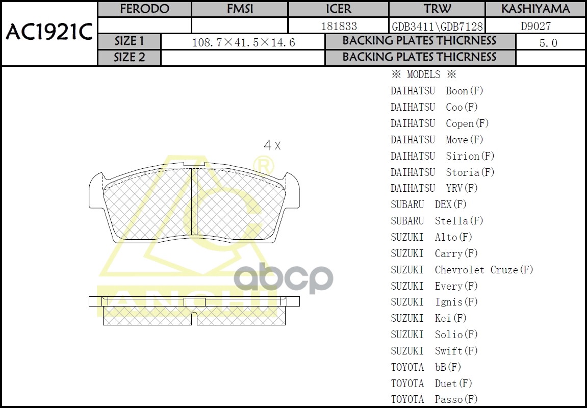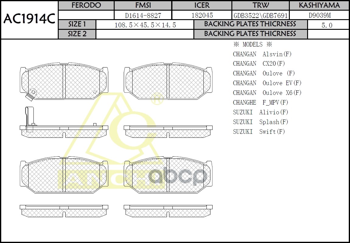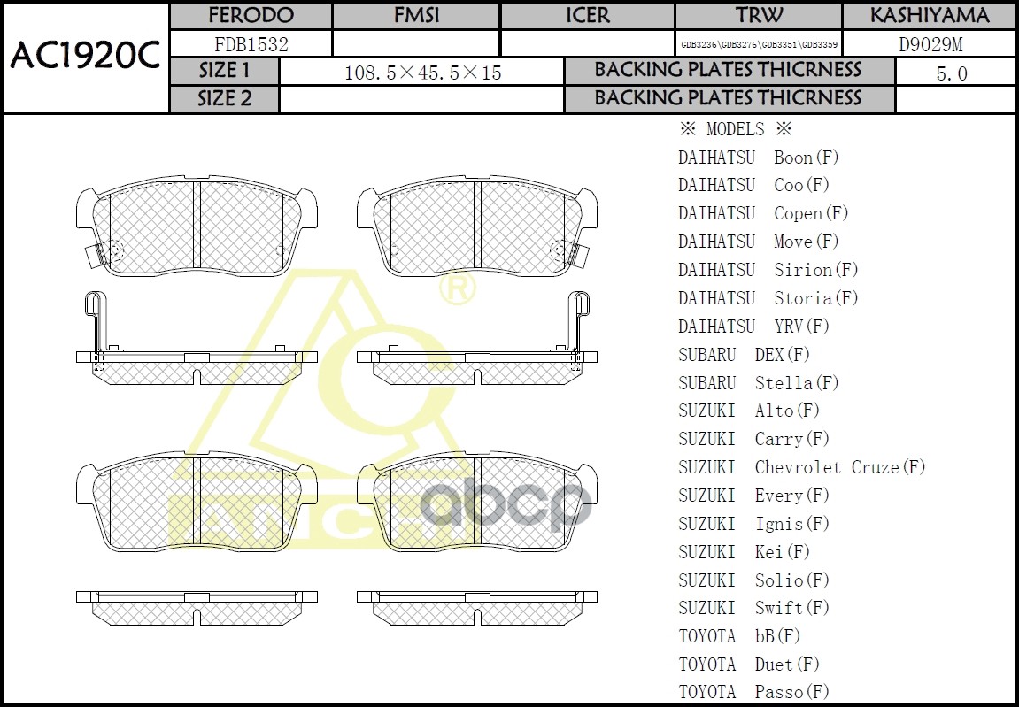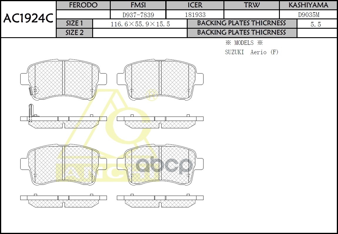 Тормозные колодки ANCHI AC1924C Suzuki AERIO LIANA RB21S, RA21S, RC51S, RD51S 01- Front