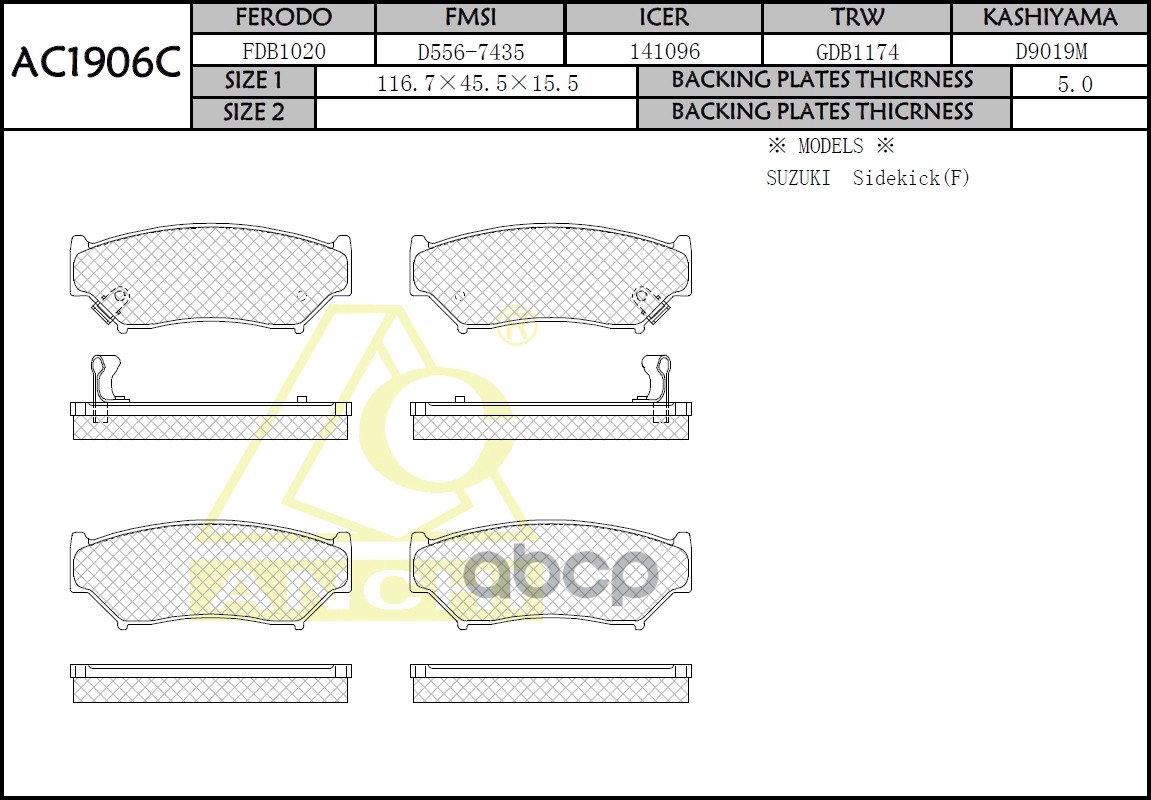 Тормозные колодки ANCHI AC1906C SUZUKI Escudo TD01W, Vitara -99, Grand Vitara - 01 Перед.