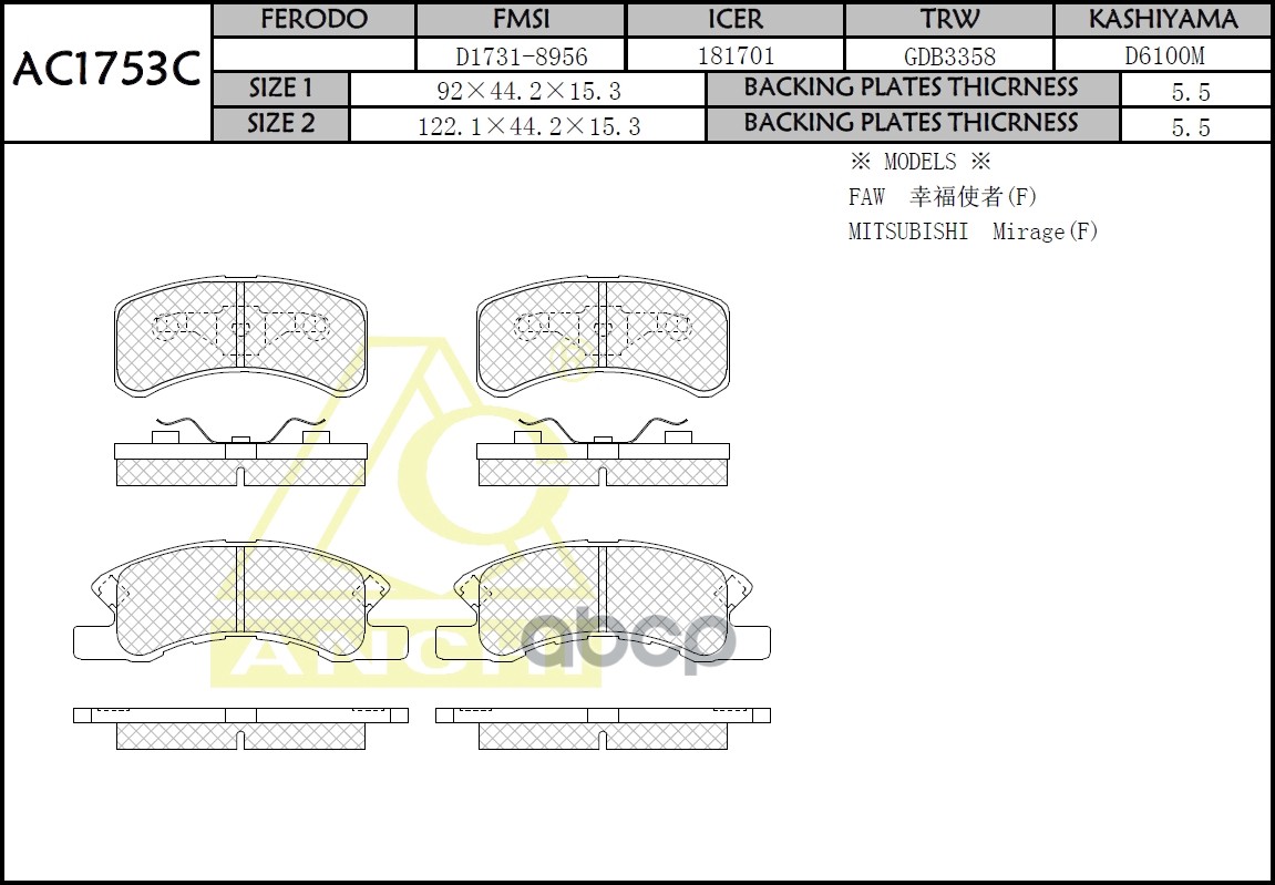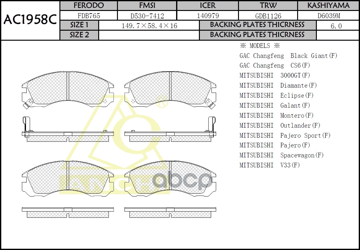 Тормозные колодки ANCHI AC1958C MMC Delica 94-,Pagero ,Chariot, Diamand, Galant Перед.