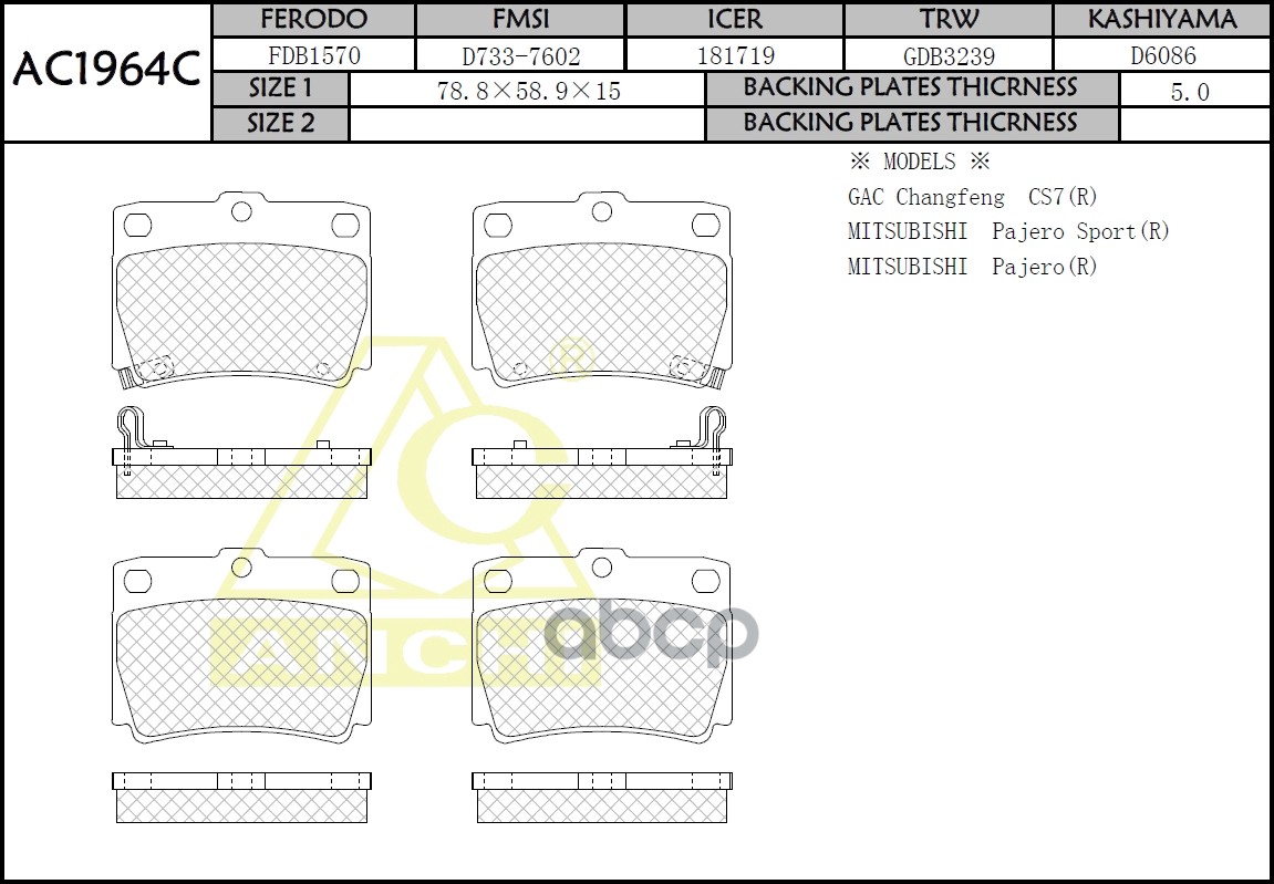 Тормозные колодки ANCHI AC1961C MMC DELICA - PD#, PF#, PE8 94-, PAJERO - V14, V2#, V34, V4#, V55 90- Задн.