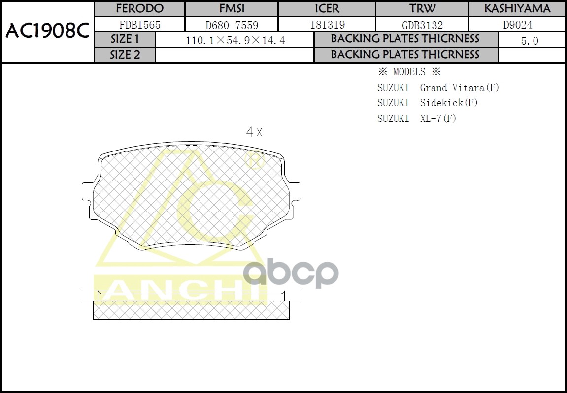 Тормозные колодки ANCHI AC1908C SUZUKI Escudo TD11W, 31W, 51W TL52W, TX92W, GrandVitara, XL7 , MAZDA Proceed Levante Перед.