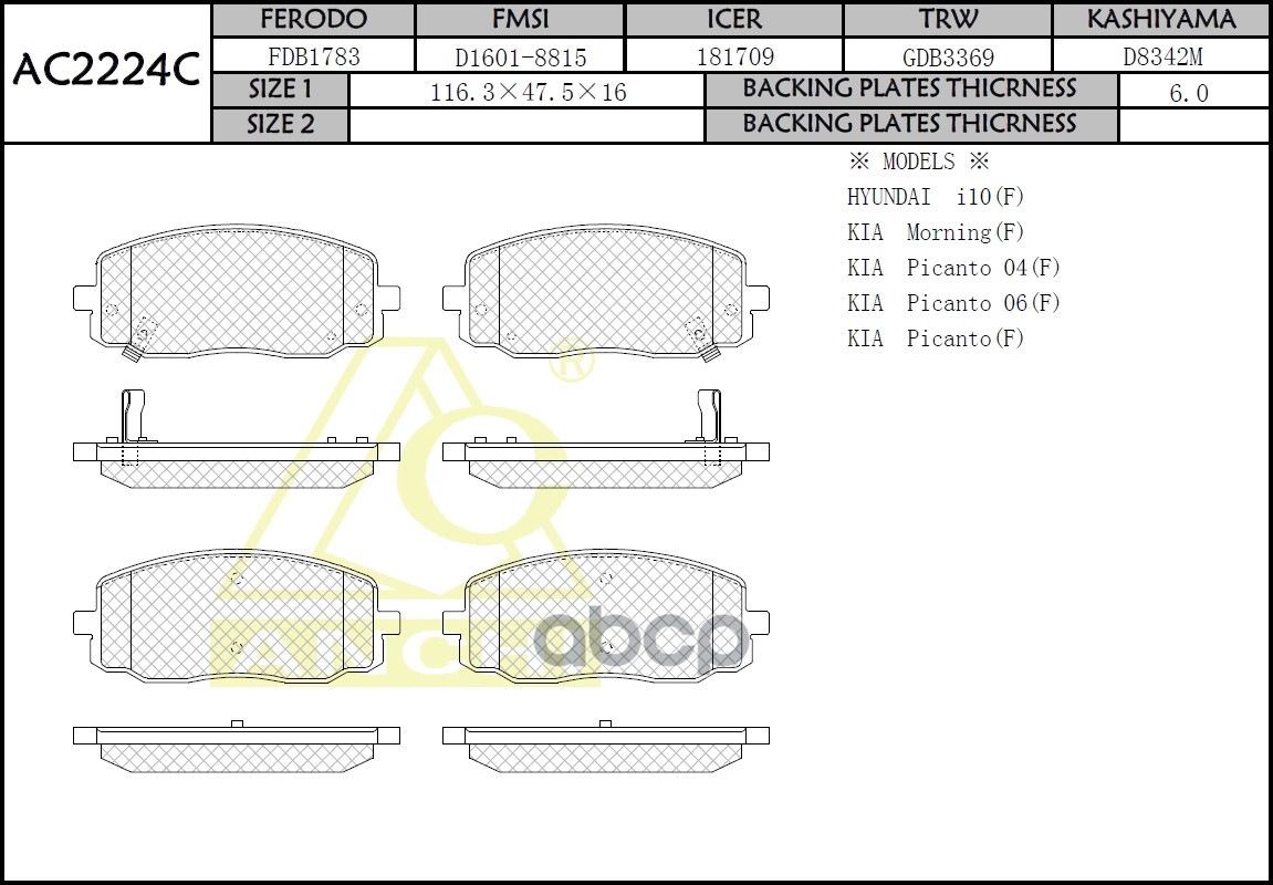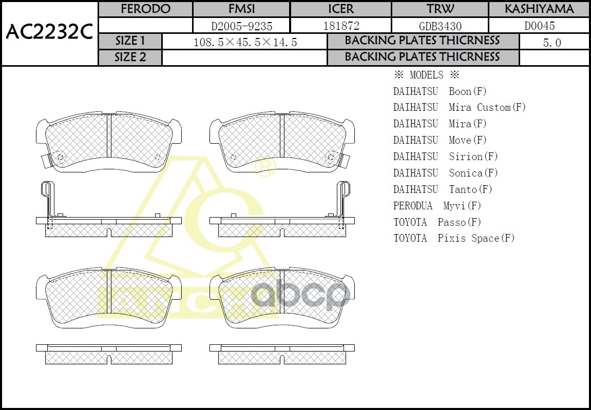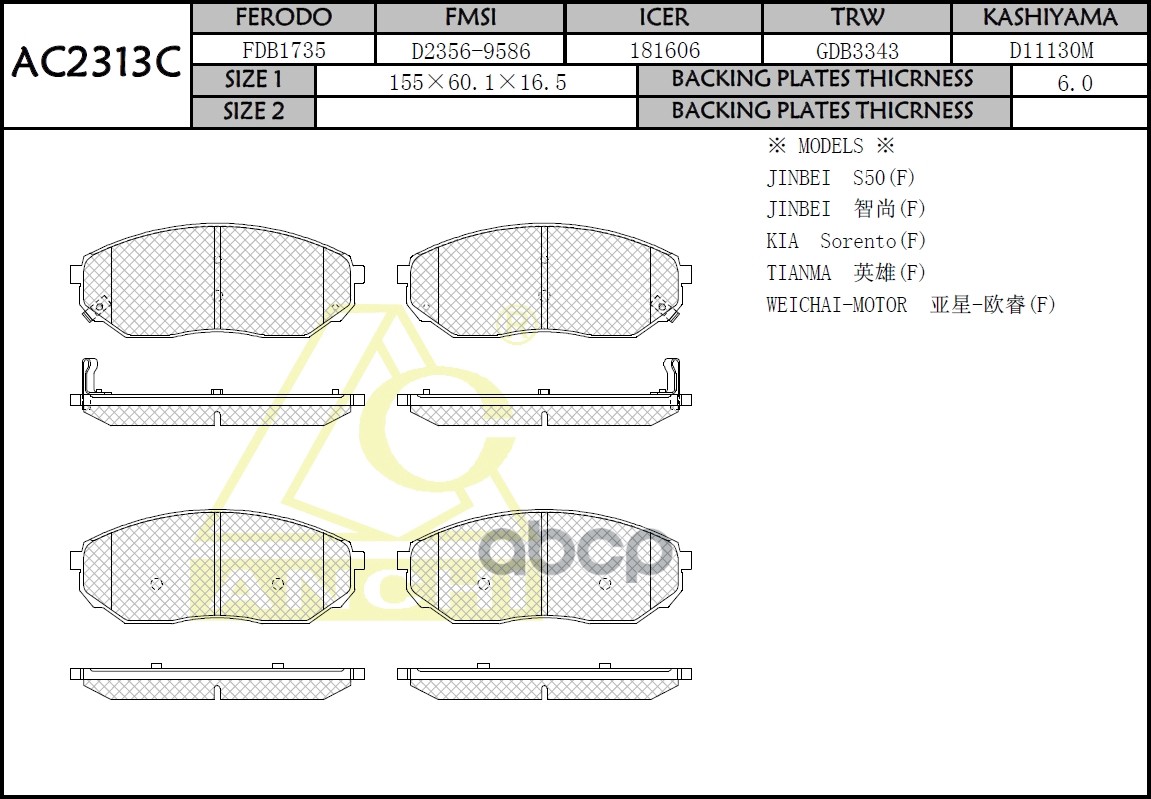 Тормозные колодки ANCHI AC2306C KIA RIO (SF)(1.3, 1.5)(02~05) KIA SPECTRA KIA SHUMA (00~) KIA CLARUS (96~) FR