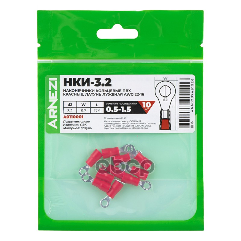 Купить запчасть A0110001 Наконечники кольцевые НКИ-3.20.5-1.5 10шт ПВХ красные, латунь луженая AWG22-16, , Max Вт ARNEZ с доставкой по России.