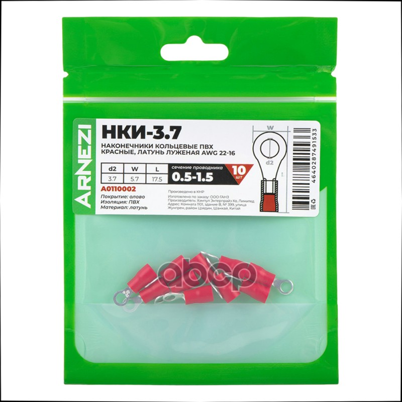 Купить запчасть A0110002 Наконечники кольцевые НКИ-3.70.5-1.5 10шт ПВХ красные, латунь луженая AWG22-16, , Max Вт ARNEZ с доставкой по России.