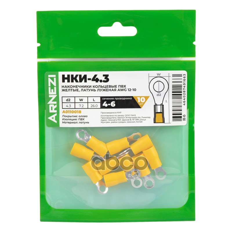 Купить запчасть A0110018 Наконечники кольцевые НКИ-4.34-6 10шт ПВХ желтые, латунь луженая AWG12-10, , Max Вт ARNEZI A01 с доставкой по России.