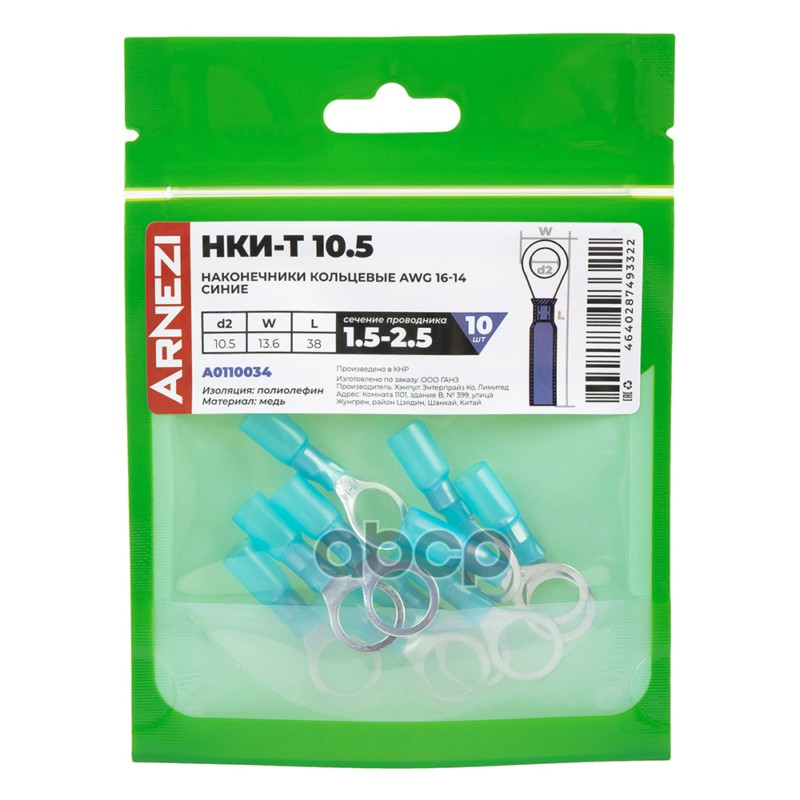 Купить запчасть A0110034 Наконечники кольцевые НКИ-Т 1.5-2.5 AWG16-14 10.5мм 10 шт синие, , Max Вт ARNEZI A0110034 с доставкой по России.
