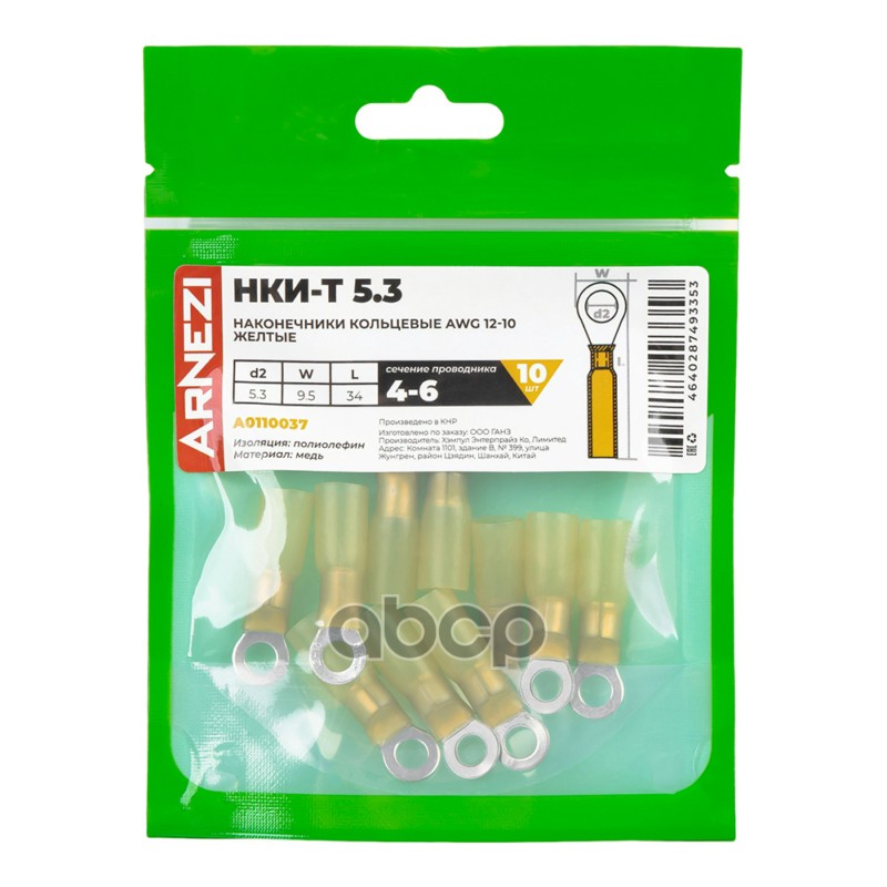 Купить запчасть A0110037 Наконечники кольцевые НКИ-Т 4-6 AWG12-10 5.3мм 10 шт желтые, , Max Вт ARNEZI A0110037 с доставкой по России.