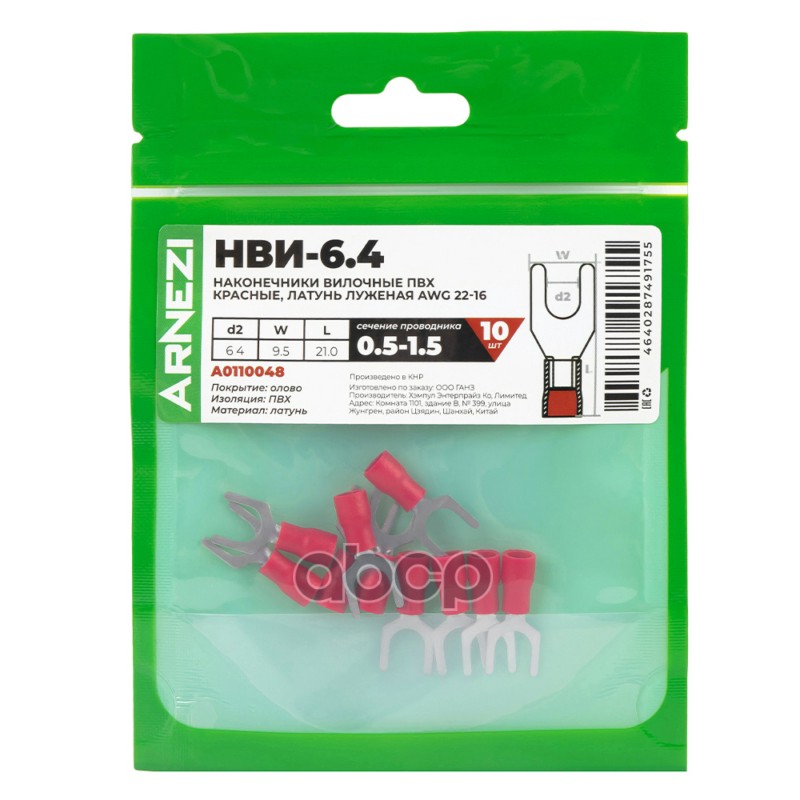 Купить запчасть A0110048 Наконечники вилочные НВИ-6.40.5-1.5 10шт ПВХ красные, латунь луженая AWG22-16, , Max Вт ARNEZI с доставкой по России.