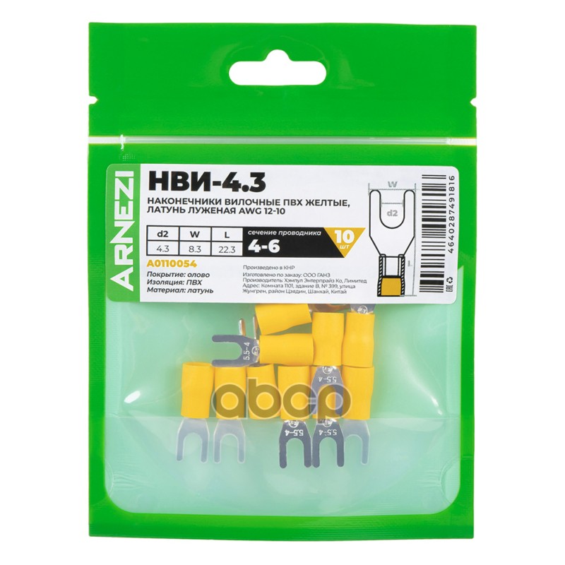 Купить запчасть A0110054 Наконечники вилочные НВИ-4.34-6 10шт ПВХ желтые, латунь луженая AWG12-10, , Max Вт ARNEZI A011 с доставкой по России.