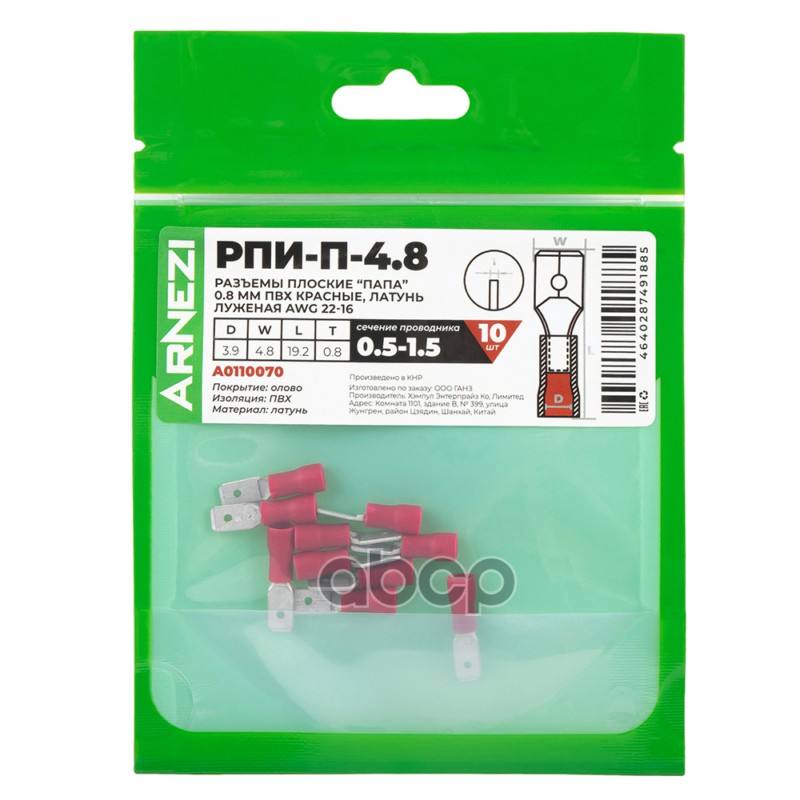 Купить запчасть A0110070 Разъемы плоские папа РПИ-П-4.80.8мм0.5-1.5 10шт ПВХ красные, латунь луженая AWG22-16, , Ma с доставкой по России.