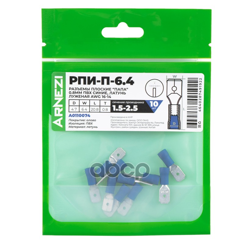 Купить запчасть A0110074 Разъемы плоские папа РПИ-П-6.30.8мм1.5-2.5 10шт ПВХ синие, латунь луженая AWG16-14, , Max с доставкой по России.